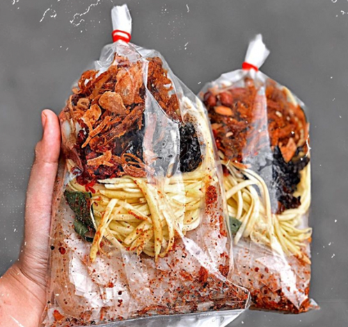 Mỗi bịch bánh có giá khoảng 20.000 đồng/bịch với đầy đủ các nguyên liệu chất lượng như khô bò, khô mực, rau răm, xoài, trứng cút, đậu phộng, muối tôm,…Ăn hết một bịch là bao no.