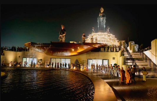 Từ trên cao nhìn xuống, một màn led “khổng lồ” với 29 mảnh ghép và hơn 480 ngọn đèn âm sàn tạo thành màn trình diễn ánh sáng đầy nghệ thuật trên đỉnh núi với các hình ảnh biểu tượng của Phật giáo như chữ Vạn, hoa sen... Xung quanh quần thể tâm linh trên đỉnh núi với tâm điểm là bức tượng Phật Bà Tây Bổ Đà Sơn cao nhất Châu Á, hệ thống chiếu sáng huyền ảo tạo nên một bức tranh đêm kỳ thú tựa như hàng ngàn vì sao đang tỏa sáng, càng tôn lên vẻ uy nghi, kỳ vĩ của quần thể tâm linh.