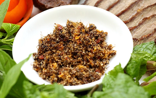 Đã mua bò một nắng thì không thể bỏ qua muối kiến vàng. Muối kiến vàng thường được dùng để chấm bò một nắng. Loại muối này khá “kén” người ăn nhưng thử một lần thôi bạn cũng nhận ra được vị ngon khá lạ của nó.