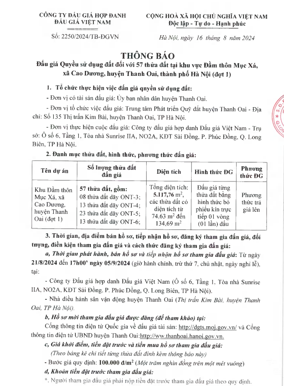 Công ty đấu giá hợp danh Việt Nam vừa có thông báo tổ chức phiên đấu giá quyền sử dụng 57 thửa đất tại khu vực Đầm, thôn Mục Xá, xã Cao Dương, huyện Thanh Oai, TP. Hà Nội (đợt 1).