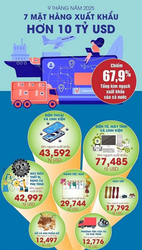 | Trong 32 mặt hàng xuất khẩu đạt trên 1 tỷ USD, có 7 mặt hàng vượt ngưỡng 10 tỷ USD, được coi là “ngôi sao” dẫn dắt xuất khẩu năm 2025. |