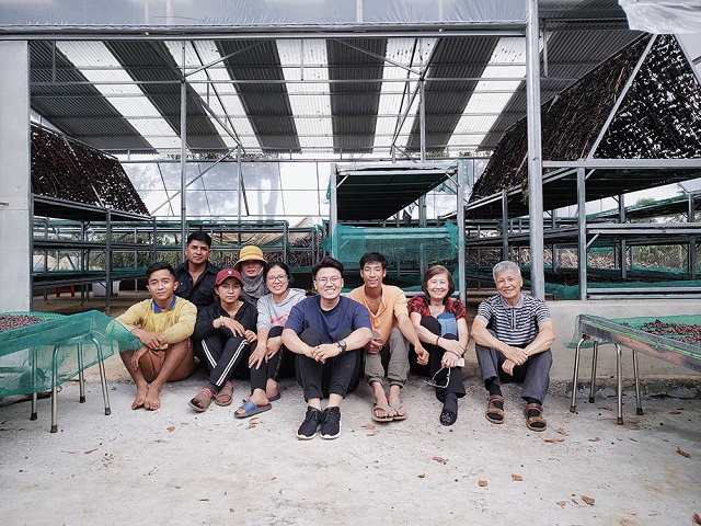 Khánh (đeo kính, giữa) đến với nông dân và bắt tay cùng họ tạo ra cà phê chất lượng.