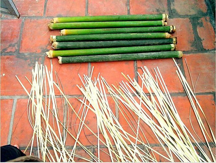Chọn những đốt giang dài từ 70-90 cm, cạo vỏ ngoài, sau đó chẻ từng miếng đều nhau. Nên ngâm ống giang trước khi chẻ để có độ mềm, còn khi chẻ thành lạt thì phơi khô để khi gói bánh sẽ chắc tay, mềm và dễ buộc.