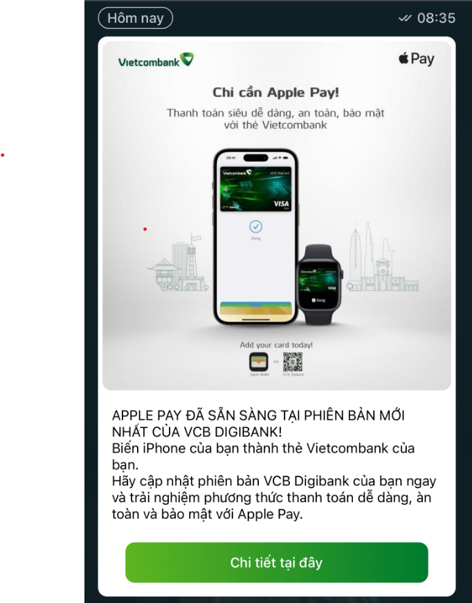 Gần đây, ngân hàng Vietcombank đã gửi thông báo tới khách hàng về việc hỗ trợ liên kết với Apple Pay thông qua ứng dụng VCB Digibank. Đây là ứng dụng giao dịch trực tuyến của ngân hàng Vietcombank, tuy nhiên thông báo mới chỉ được gửi cho số lượng người dùng nhất định.