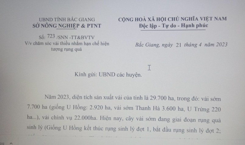 | Văn bản yêu cầu các huyện chỉ đạo cơ quan chuyên môn hướng dẫn người dân chăm sóc vải thiều nhằm hạn chế hiện tượng rụng quả đảm bảo năng suất, chất lượng. |