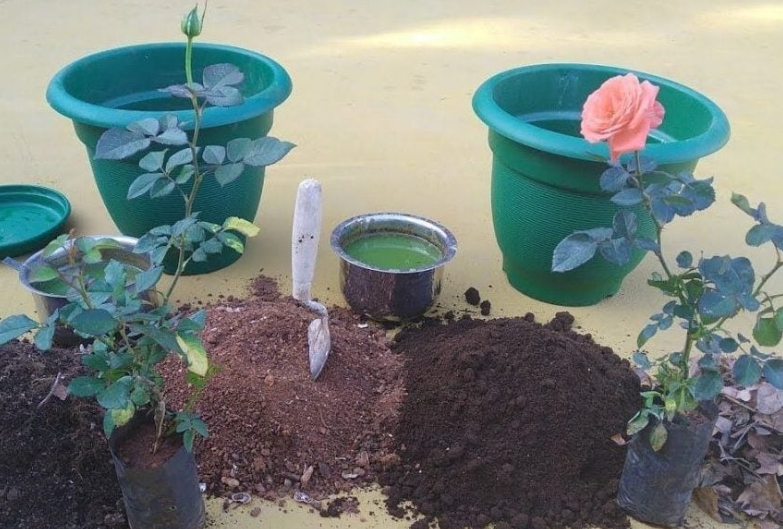 Bón một ít phân lót ở dưới đáy chậu sau đó dùng kéo cắt bỏ bao đất bọc ở gốc cây, giữ nguyên bầu đất. Đặt cây hoa hồng vào ngay chính giữa chậu, từ từ bỏ giá thể, đất trồng đã được trộn sẵn vào đầy chậu. Dùng tay ấn nhẹ cho chặt gốc. Lưu ý là không lấp giá thể đất trồng qua mắt ghép. Tưới đẫm cây, đem để trong mát tầm 3-5 ngày rồi mới đem ra phơi nắng dần dần.
