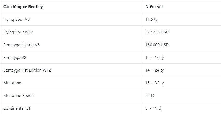 Cập nhật bảng giá xe hãng Bentley mới nhất tháng 8/2023 Cập nhật bảng giá xe hãng Bentley mới nhất tháng 8/2023