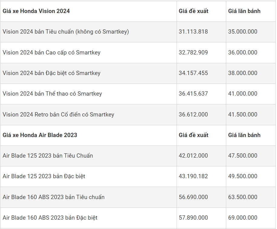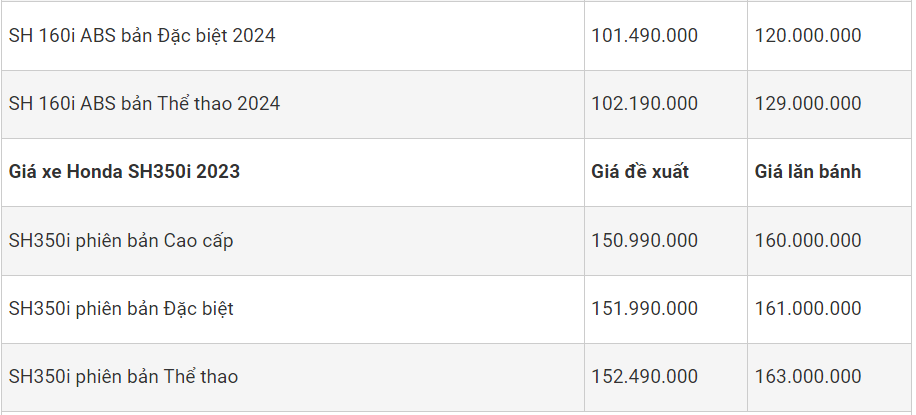 Theo đó, giá bán mẫu Honda Vision 2023 đang có giá bán thực tế cao hơn đề xuất từ 0,5 - 2 triệu đồng tùy phiên bản. Các mẫu xe ga Lead 2023, Air Blade 125 2023 đang có các mức giá ổn định thấp hơn giá đề xuất 1-2 triệu đồng. Riêng mẫu xe tay ga SH 350i lắp ráp tại Việt Nam đang có giá bán thực tế thấp hơn giá đề xuất vài triệu đồng.
