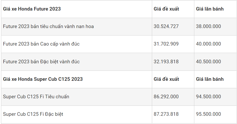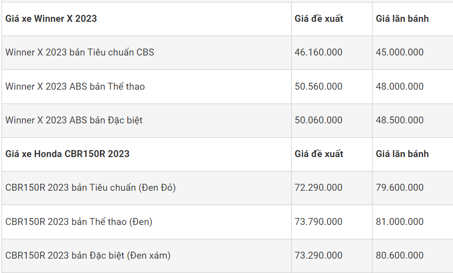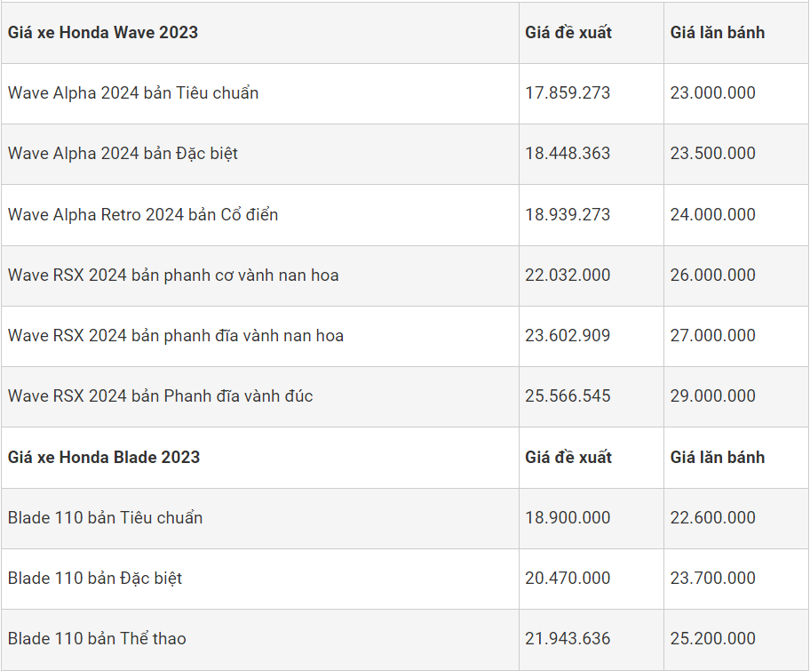 Trong khi đó, các mẫu xe số Honda vẫn bán với mức giá khá bình ổn, một số mẫu xe số Honda có giá bán thực tế ở một số nơi thấp hơn so với giá đề xuất như Wave Alpha 110, Wave RSX, thấp hơn đề xuất từ 1- 2 triệu đồng. Trong khi đó mẫu xe Winner X đang bán thấp hơn giá đề xuất từ 10 triệu đồng tại các đại lý TP.Hồ Chí Minh.