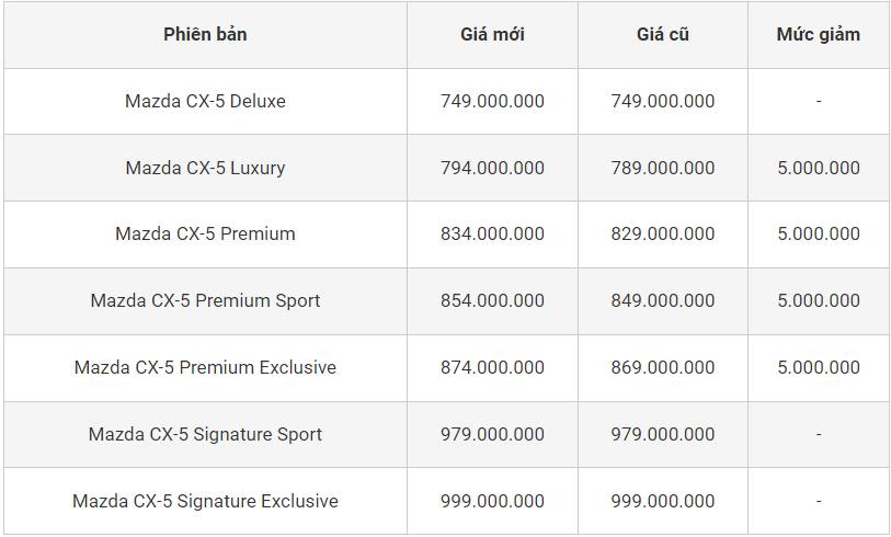 Đối với Mazda CX-5 phiên bản 2.0L Luxury có giá mới là 794 triệu đồng, phiên bản 2.0L Premium giá mới là 834 triệu đồng, phiên bản 2.0L Premium Sport có giá mới là 854 triệu đồng và phiên bản 2.0L Premium Exclusive có giá mới là 874 triệu đồng. Bên cạnh đó, các phiên bản còn lại của mẫu ô tô này như 2.0L Deluxe, 2.5L Signature Sport, 2.5L Signature Exclusive đều có giá không đổi so với tháng trước.