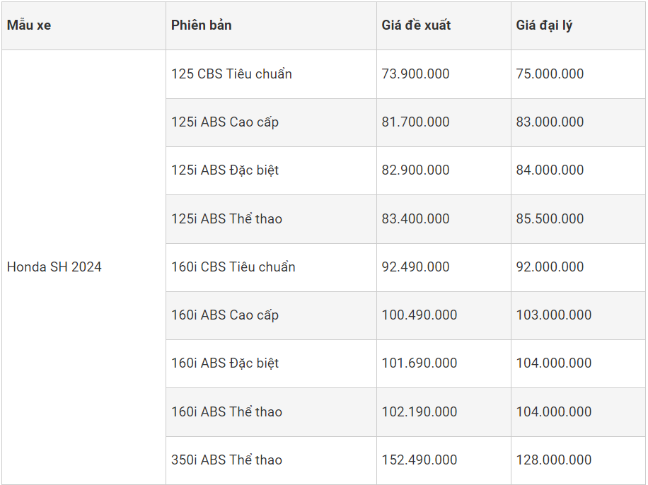 Bảng giá xe Honda SH mới nhất giữa tháng 2/2024 tại đại lý