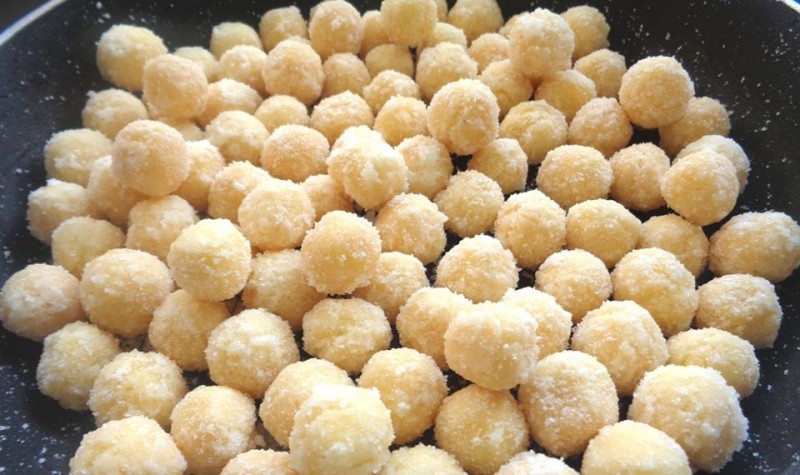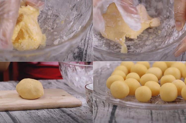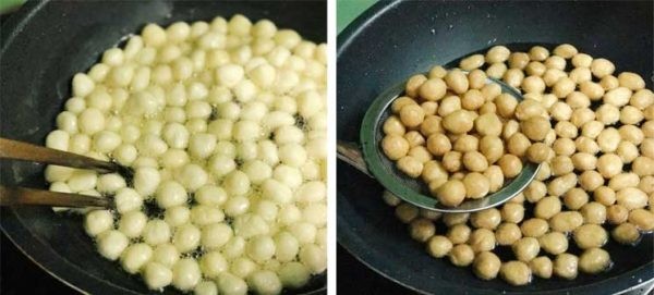Bột sau khi nhào với trứng gà sẽ được chia nhỏ, vo thành các viên tròn đều nhau rồi thả vào chảo ngập mỡ nóng, chiên cho đến khi bánh phồng đủ độ và đồng loạt chuyển màu vàng đều thì vớt ra để cho ráo mỡ. Lửa phải liu riu nhỏ, nếu để lửa lớn quá, bánh sẽ cháy và mất đi vị thơm của trứng.