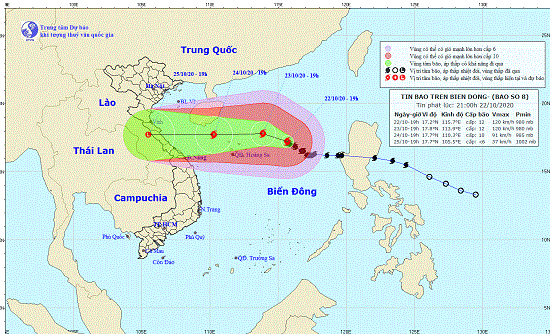 Thông tin từ Trung tâm dự báo khí tượng thủy văn quốc gia, tối 22/10, vị trí tâm bão ở khoảng 17,2 độ Vĩ Bắc; 115,7 độ Kinh Đông, cách quần đảo Hoàng Sa khoảng 350km về phía Đông. Sức gió mạnh nhất vùng gần tâm bão mạnh cấp 12 (115-135km/giờ), giật cấp 15. Bán kính gió mạnh từ cấp 6, giật từ cấp 8 trở lên khoảng 250km tính từ tâm bão; bán kính gió mạnh từ cấp 10, giật từ cấp 12 trở lên khoảng 150km tính từ tâm bão.
