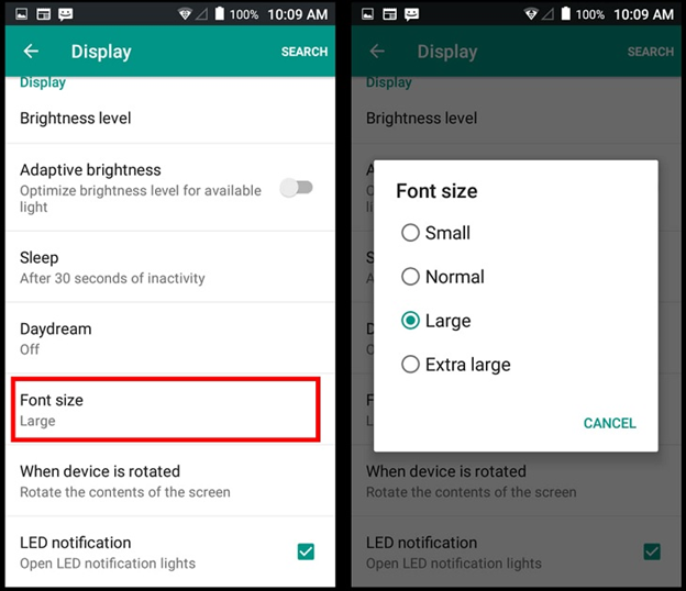 Bạn vào Settings > Display > Font Size Ở mục Font Size này, bạn có thể chọn các kích cỡ chữ hiển thị theo ý muốn của mình. Các loại điện thoại Android khác nhau sẽ có những tùy chọn khác nhau, nhưng thông thường sẽ có 4 kiểu thiết lập: Small (nhỏ), Normal (bình thường), Large (lớn) hoặc Extra Large (rất lớn).