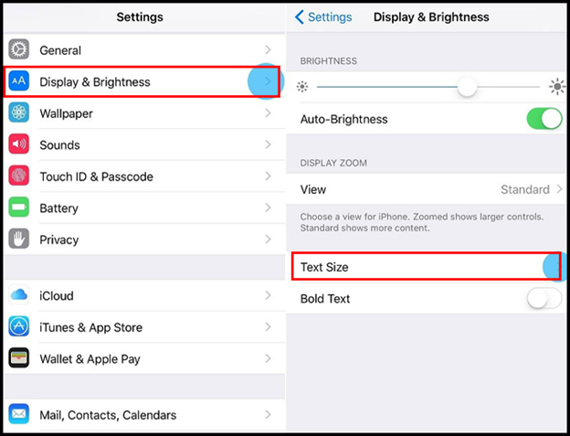 Bạn vào Settings > Display & Brightness > Text Size. Bạn có thể kéo thanh trượt sang trái hoặc phải để chọn cỡ chữ theo ý mình.