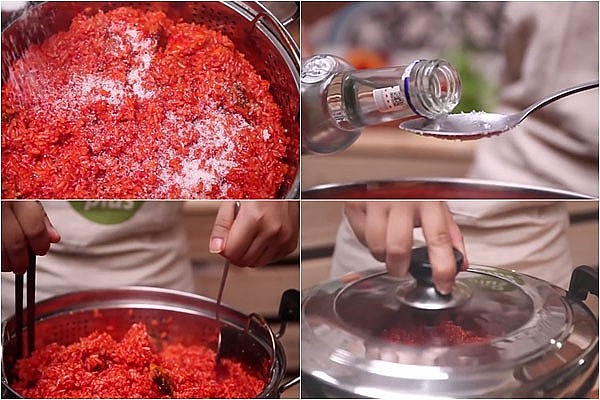 Bước 4: Cho gạo vào xửng hấp để đồ xôi trong khoảng 25 - 30 phút. Khi xôi gấc chín mềm, dùng đũa đảo đều, thêm 1 thìa dầu ăn trộn cùng và đồ xôi thêm 5 phút. Dầu ăn giúp xôi gấc đỏ bóng đẹp hơn.