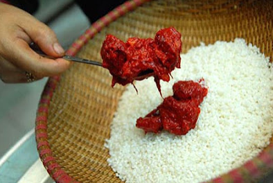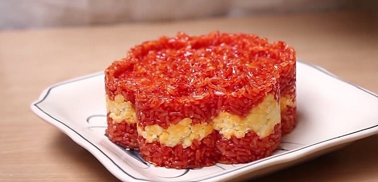Xôi gấc có màu đỏ đẹp mắt, hương vị thơm ngon nên là món không thể thiếu trong mâm cỗ cúng ngày Rằm tháng Chạp.