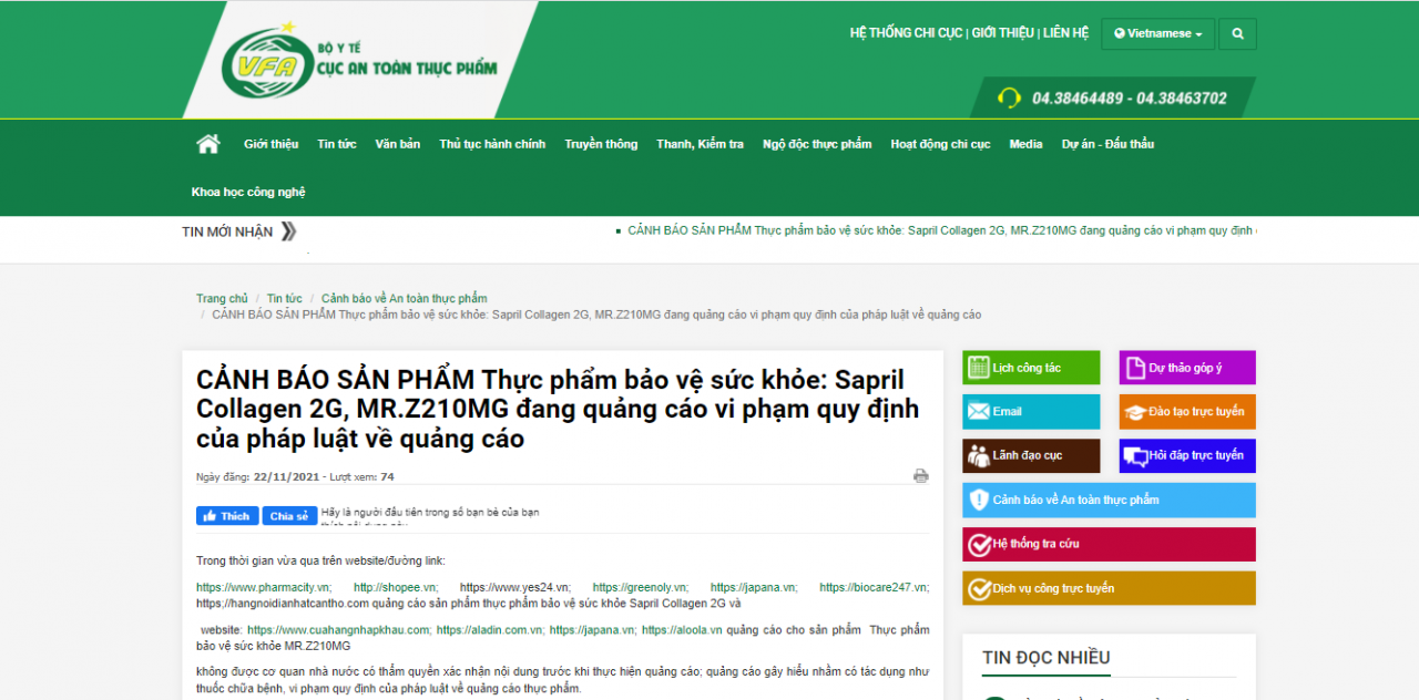 Cục An toàn thực phẩm cho biết, trong thời gian vừa qua trên website/đường link: