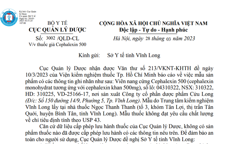 Theo đó, Cục Quản lý Dược nhận được Văn thư số 213/VKNT-KHTH đề ngày 10/3/2023 của Viện Kiểm nghiệm thuốc TP. Hồ Chí Minh báo cáo về việc mẫu sản phẩm có các thông tin ghi nhãn như sau: Viên nang cứng Cephalexin 500 (cephalexin monohydrat tương ứng với cephalexin khan 500mg), số lô: 04310322, NSX: 310322, HD: 310225, VD-25166-17, nơi sản xuất Công ty cổ phần Dược phẩm Cửu Long (Đ/c: Số 150 đường 14/9, phường 5, TP. Vĩnh Long).