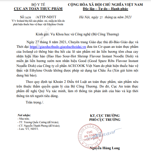Liên quan đến việc mì Hảo Hảo và miến Good của Công ty Cổ phần Acecook Việt Nam bị thu hồi bởi Cơ quan An toàn Thực phẩm Ireland (FSAI) do có chứa chất Ethylene Oxide, hiện Bộ Công Thương cũng đã vào cuộc đề nghị Công ty Cổ phần Acecook Việt Nam khẩn trương báo cáo về quy trình sản xuất và sự khác biệt giữa lô sản phẩm tiêu thụ trong nước và xuất khẩu đối với 02 sản phẩm mì Hảo Hảo và miến Good do công ty sản xuất để đánh giá sự xuất hiện chất Ethylene Oxide.