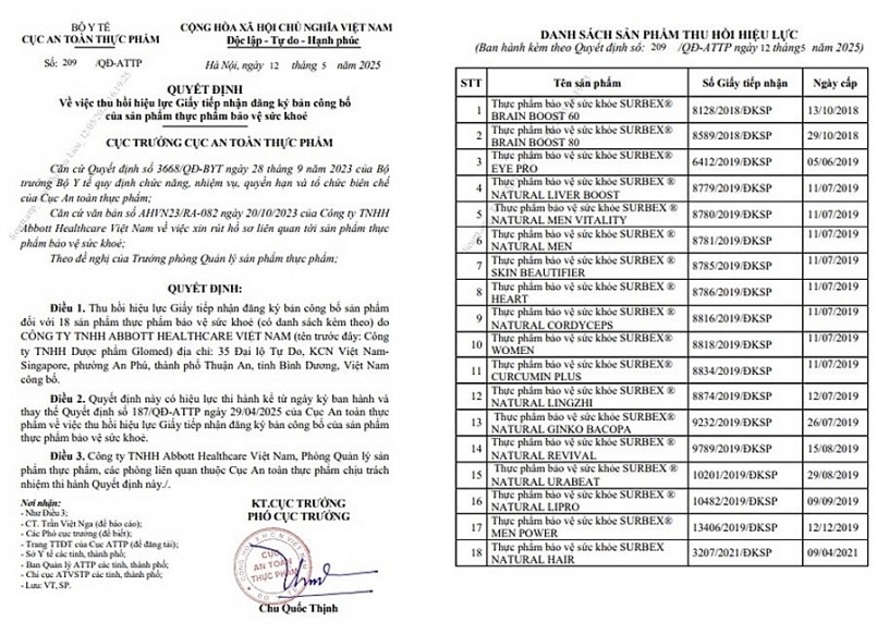 Ngày 12/5/2025, Cục An toàn thực phẩm (Bộ Y tế) đã ban hành Quyết định số 209/QĐ-ATTP về việc thu hồi hiệu lực Giấy tiếp nhận đăng ký bản công bố sản phẩm đối với 18 thực phẩm bảo vệ sức khỏe của Công ty TNHH Abbott Healthcare Việt Nam. Đây là động thái được thực hiện theo đề nghị rút hồ sơ từ chính doanh nghiệp.