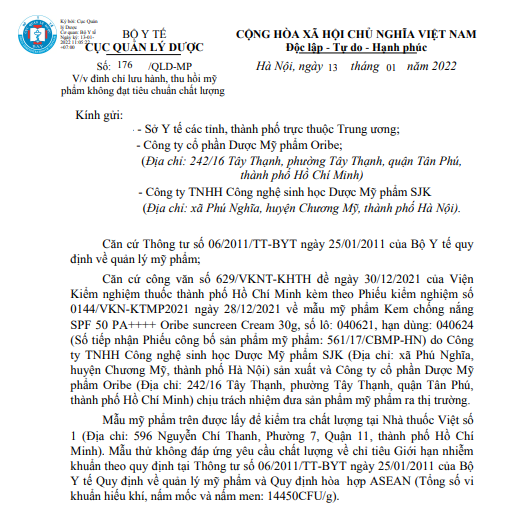 Cục Quản lý Dược yêu cầu, Công ty cổ phần Dược Mỹ phẩm Oribe phối hợp với Công ty TNHH Công nghệ sinh học Dược Mỹ phẩm SJK gửi thông báo thu hồi tới những nơi phân phối, sử dụng sản phẩm Kem chống nắng SPF 50 PA++++ Oribe suncreen Cream 30g, số lô: 040621, hạn dùng: 040624 (Số tiếp nhận Phiếu công bố sản phẩm mỹ phẩm: 561/17/CBMPHN). Tiến hành thu hồi toàn bộ lô mỹ phẩm không đáp ứng quy định. Gửi báo cáo thu hồi sản phẩm trên về Cục Quản lý Dược trước ngày 30/01/2022.