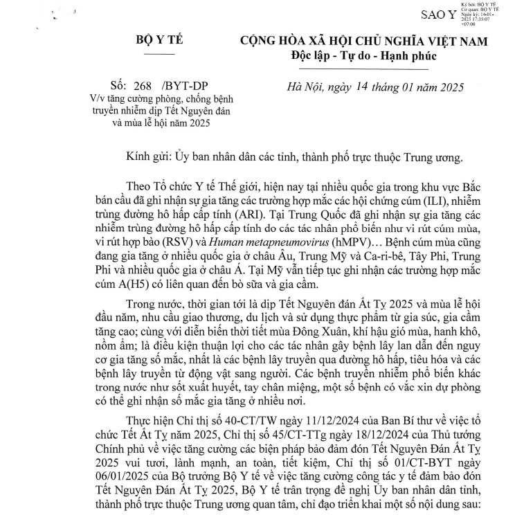 Trước nguy cơ đó, Bộ Y tế đã có văn bản gửi UBND các tỉnh, thành phố về việc tăng cường phòng, chống bệnh truyền nhiễm dịp Tết Nguyên đán và mùa lễ hội năm 2025. Thực hiện Chỉ thị số 40-CT/TW ngày 11/12/2024 của Ban Bí thư về việc tổ chức Tết Ất Tỵ năm 2025, Chỉ thị số 45/CT-TTg ngày 18/12/2024 của Thủ tướng Chính phủ về việc tăng cường các biện pháp bảo đảm đón Tết Nguyên Đán Ất Tỵ 2025 vui tươi, lành mạnh, an toàn, tiết kiệm, Chỉ thị số 01/CT-BYT ngày 06/01/2025 của Bộ trưởng Bộ Y tế về việc tăng cường công tác y tế đảm bảo đón Tết Nguyên Đán Ất Tỵ 2025, Bộ Y tế đề nghị UBND tỉnh, thành phố trực thuộc Trung ương quan tâm, chỉ đạo triển khai một số nội dung sau, cụ thể:
