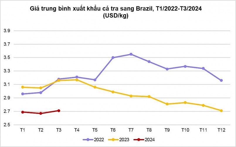 Giá trung bình nhập khẩu cá tra Việt Nam sang Brazil trong tháng 2/2024 chứng kiến mức thấp nhất trong 3 năm trở lại đây, kể từ năm 2022, ở mức 2,67 USD/kg. Ba tháng đầu năm nay, giá trung bình nhập khẩu cá tra lần lượt giảm 12%-14% so với cùng kỳ năm ngoái.