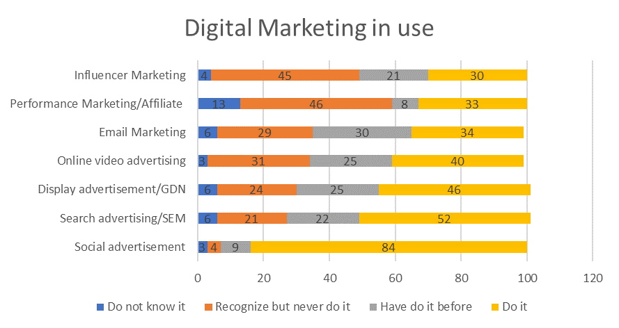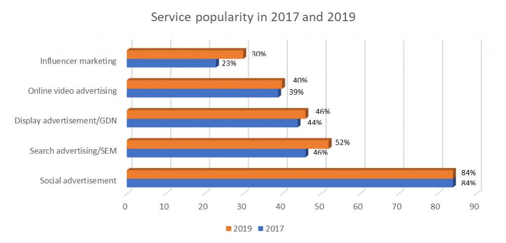84% doanh nghiệp được khảo sát quảng cáo trên mạng xã hội. Theo sau là hình thức quảng cáo tìm kiếm (SEM) và quảng cáo hiển thị (GDN) với tỷ lệ sử dụng lần lượt là 52% và 46%. Có thể nói, quảng cáo trên mạng xã hội là hình thức phổ biến với mọi loại hình và quy mô của công ty. Theo thống kê, có tới 94% doanh nghiệp lớn và vừa chi tiêu cho loại hình này, con số này là 79% với doanh nghiệp nhỏ. Trong đó, những hoạt động marketing kỹ thuật số còn lại thường được doanh nghiệp lớn và vừa sử dụng. Đó là lý do Influencer Marketing được sử dụng với tỷ lệ không cao, 35% doanh nghiệp lớn và vừa và 11% với doanh nghiệp nhỏ. So với năm 2017, hình thứ SEM và Influencer Marketing đang ngày càng phổ biến hơn, trong khi đó, quảng cáo trên mạng xã hội vẫn giữ vững vị trí đầu tiên 3 năm gần đây (Biểu đồ 3).