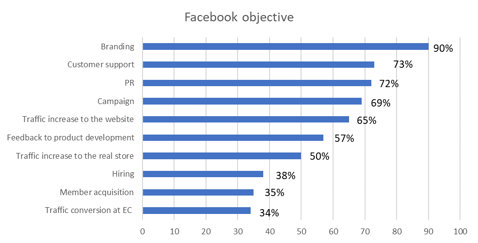 Khảo sát của Q&Me (2020) về mục tiêu của chiến lược marketing kỹ thuật số của các doanh nghiệp Việt Nam trên nền tảng Facebook cho thấy Facebook được sử dụng để phục vụ mục đích phát triển thương hiệu (branding) và hỗ trợ khách hàng với lần lượt tỷ lệ là 90% và 73% (Biểu đồ 4). Ngoài ra, những mục tiêu phổ biến khác mà doanh nghiệp sử dụng Facebook là quan hệ công chúng (PR), quảng bá chiến dịch, và tăng lượng truy cập.