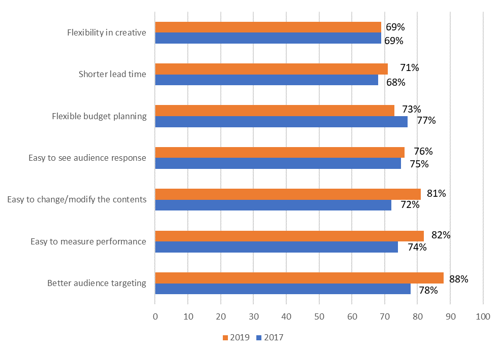 Nhìn nhận về ưu và nhược điểm của marketing kỹ thuật số, các doanh nghiệp nhận định ưu điểm lớn nhất của marketing kỹ thuật số là khả năng “tiếp cận khách hàng chính xác hơn (88%)”, “đo lường hiệu suất dễ dàng (82%)” và “quản lý nội dung dễ dàng (81%)” (Biểu đồ 5). Mặt khác, nhược điểm chủ yếu của marketing kỹ thuật số chính là khả năng tiếp cận. Cụ thể, hai yếu tố “khó lòng tiếp cận nhóm khách hàng lớn tuổi” và “khó tiếp cận khu vực nông thôn” là hai nhược điểm lớn nhất. Điều này là do Internet chưa thực sự phổ biến với hai nhóm khách hàng này. Tại khu vực nông thôn, người dân tiếp nhận thông tin chủ yếu vẫn qua các kênh truyền thống (truyền thanh, báo đài). Tuy nhiên, so sánh với năm 2018, các nhược điểm của marketing kỹ thuật số đang có dấu hiệu cải thiện.
