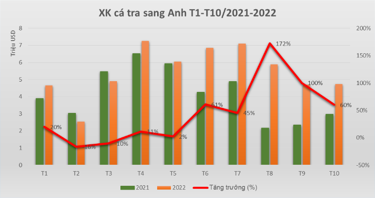 Riêng trong tháng 10/2022, xuất khẩu cá tra sang Anh vẫn giữ được tăng trưởng 60% đạt 4,7 triệu USD. Luỹ kế 10 tháng đầu năm, xuất khẩu cá tra sang thị trường này mang về 54,7 triệu USD, chiếm 2,5% tổng xuất khẩu cá tra của Việt Nam.