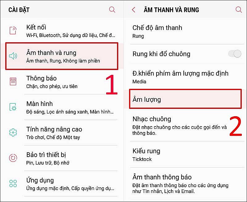 Bạn tăng âm lượng nhạc chuông điện thoại bằng cách vào Cài đặt > Âm thanh và rung > Âm lượng.