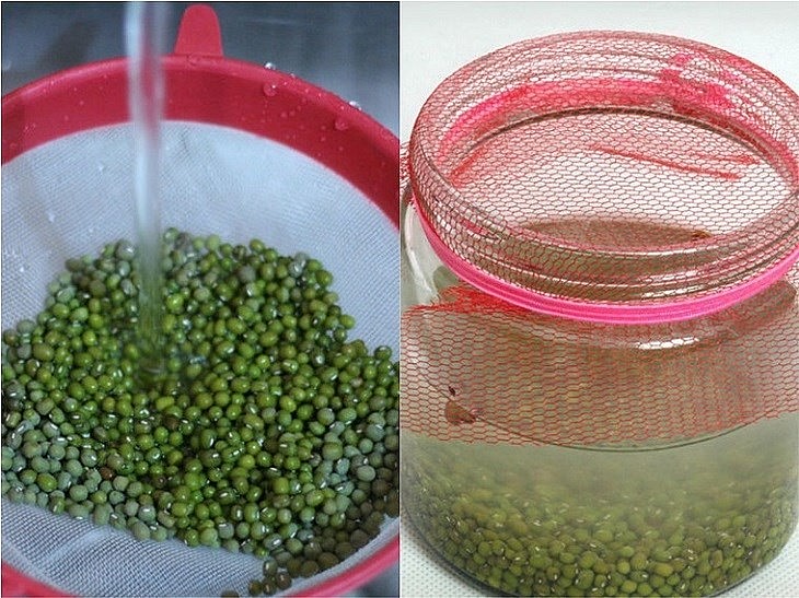 Kế đến, hãy ngâm đậu xanh trong nước khoảng 3 tiếng sau đó chắt bỏ nước. Nếu được thì hãy dùng nước lạnh và nước sôi theo tỷ lệ 3 lạnh : 2 sôi thì giá sẽ nảy mầm nhanh hơn đấy.