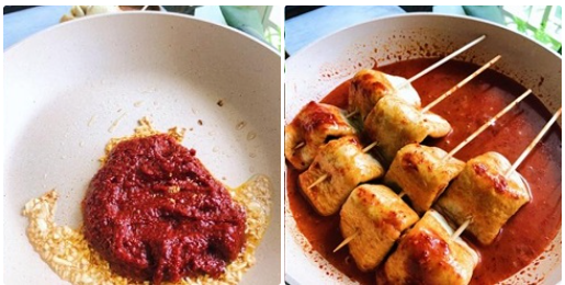 Cho xiên chả cá vào chảo sốt, trở chả cá để không bị cháy nhé. Bạn dùng muỗng rưới nước sốt đều lên xiên chả, để khoảng 2 - 3 phút cho chả cá ngấm sốt rồi tắt bếp.