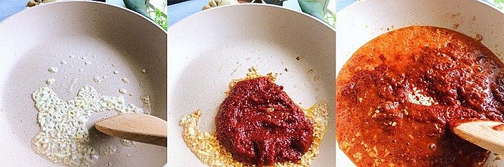Bắc chảo lên bếp với 1 muỗng canh dầu ăn, cho tỏi băm vào phi vàng. Đổ phần sốt vừa mới làm vào xào sơ, để lửa vừa, cho thêm 30ml nước cho sốt loãng hơn.