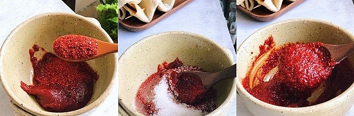 Cho 2 muỗng canh tương ớt, 4 muỗng cà phê ớt bột, 1 muỗng canh giấm, 2 muỗng canh đường trắng vào tô và trộn đều. Bạn có thể thay thế đường bằng mật ong hay si rô bắp tùy ý thích nhé.