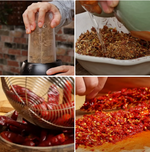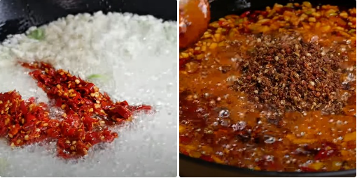 Cho vào chảo 3 muỗng canh xốt tương Tứ Xuyên truyền thống, 2 muỗng canh xốt tương đen, 2 muỗng canh tiêu xanh Tứ Xuyên, 2 muỗng canh đường phèn, thêm phần gia vị khô đã ngâm với rượu vào, cuối cùng là 1/2 chén mẻ.