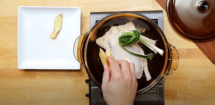 Bắc nồi nước khoảng 2 - 3 lít nước, nấu lửa lớn cho sôi. Cho gà đã chuẩn bị vào, thêm 3 - 4 lát gừng và bó hành đã chuẩn bị vào, hầm gà khoảng 2 tiếng trong lửa nhỏ để lấy nước dùng.