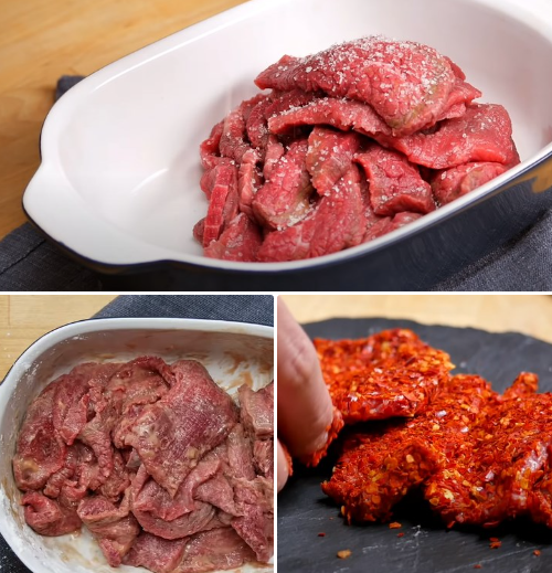 Cuối cùng cho từng miếng bò lăn qua bột ớt khô.