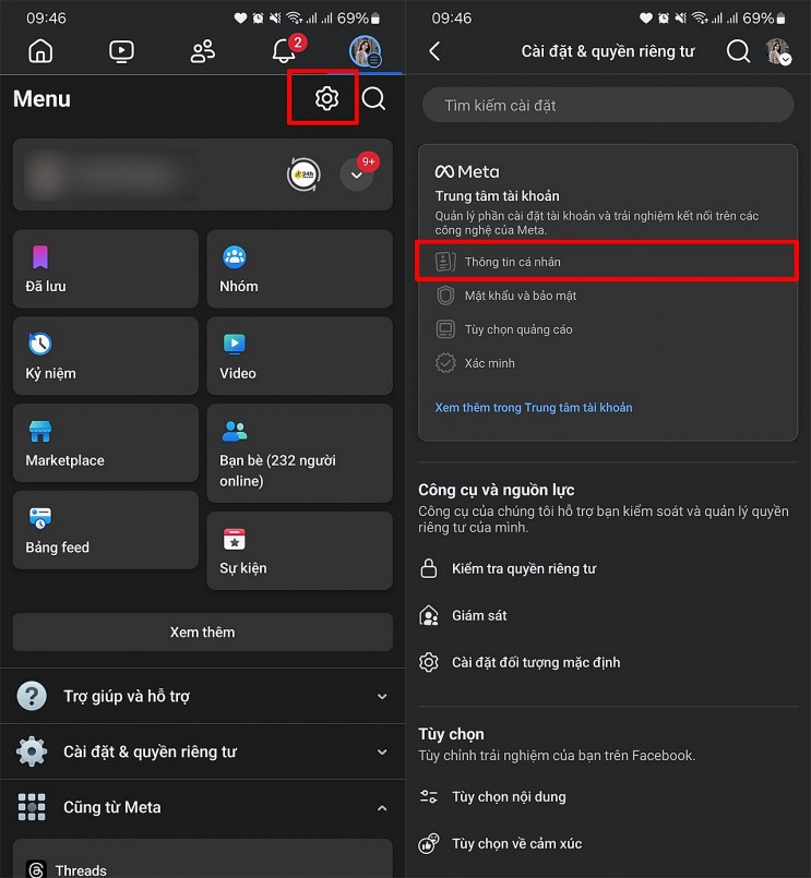 Mở ứng dụng Facebook trên điện thoại > Nhấn chọn vào biểu tượng Cài đặt > Chọn tiếp đến mục Thông tin cá nhân để tiến hành xác minh tài khoản facbook.
