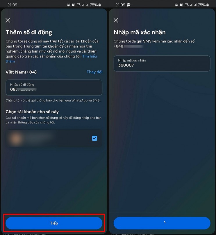 Giao diện thêm số điện thoại sẽ hiển thị lại, hãy nhấn vào Tiếp 1 lần nữa > Lúc này Facebook đã thêm số điện thoại của bạn vào tài khoản và gửi cho bạn một mã xác minh về số điện thoại đó > Hãy kiểm tra và điền vào ô để Tiếp tục xác minh là xong.