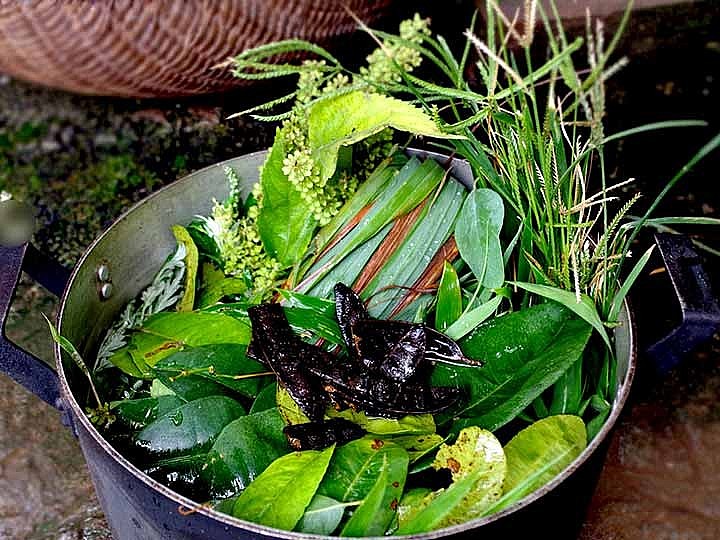 Nồi lá xông gồm lá sả, hương nhu, lá bưởi, tía tô, lá chanh… xông trị cảm cúm rất hiệu quả. |
