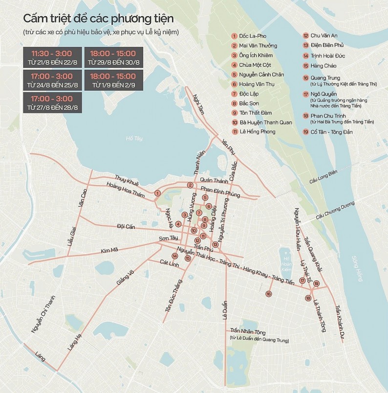 Lưu ý giao thông dịp lễ: Trong các ngày hợp luyện (21, 24/8), sơ duyệt (27/8), tổng duyệt (30/8) và đại lễ 2/9, nhiều tuyến đường trung tâm sẽ bị cấm hoặc hạn chế lưu thông. Du khách nên kiểm tra thông tin phân luồng và lên kế hoạch lộ trình sớm để tránh bị ảnh hưởng.