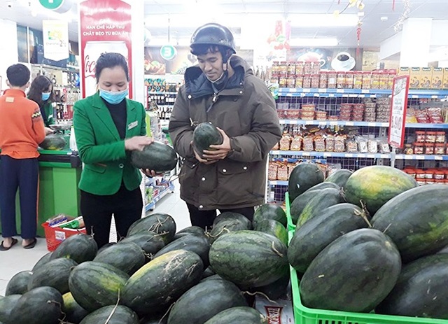 Người dân mua dưa hấu tại siêu thị Hapro Thành Công (Hà Nội).