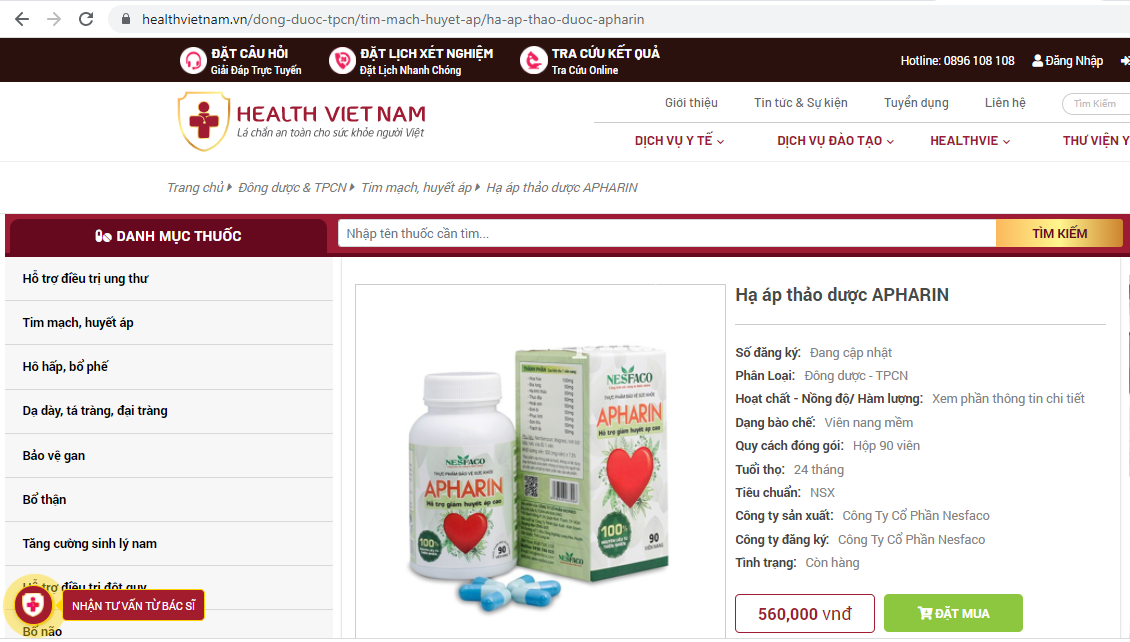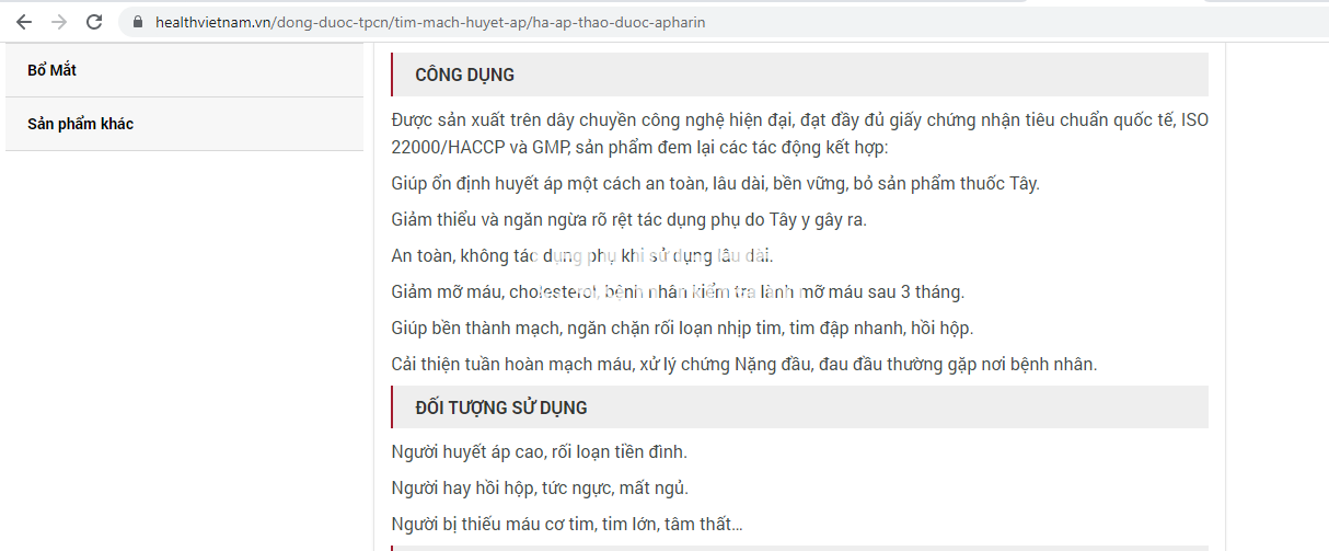 Theo khảo sát của Phóng viên, hiện tại các website trên, cụ thể là https://healthvietnam.vn/dong-duoc-tpcn/tim-mach-huyet-ap/ha-ap-thao-duoc-apharin sản phẩm Apharin đang được quảng cáo: Sản phẩm được sản xuất trên dây chuyền công nghệ hiện đại, đạt đầy đủ giấy chứng nhận tiêu chuẩn quốc tế, ISO 22000/HACCP và GMP.
