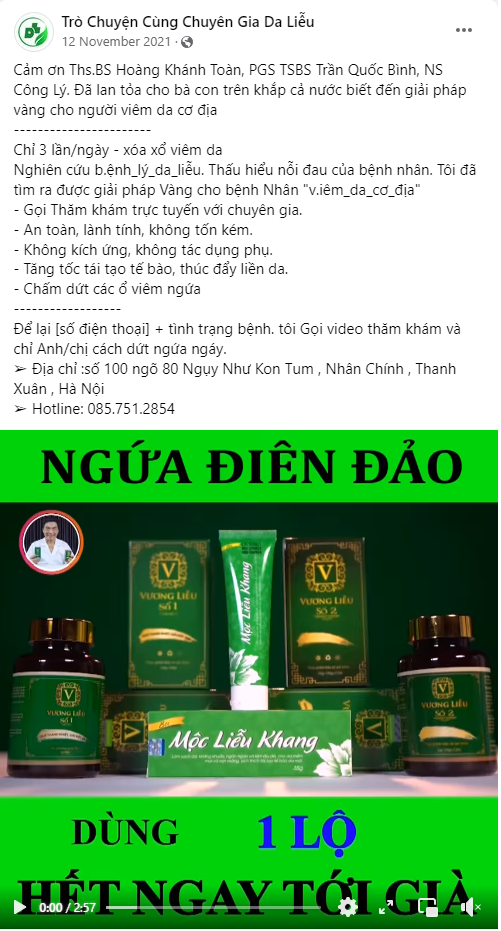 Theo đó, tại link https://www.facebook.com/Tr%C3%B2-Chuy%E1%BB%87n-C%C3%B9ng-Chuy%C3%AAn-Gia-Da-Li%E1%BB%85u-111701341313305 - Facebook Page “Trò Chuyện Cùng Chuyên Gia Da Liễu” đã giới thiệu sản phẩm TPBVSK Vương Liễu số 1 có thể “xóa xổ viêm da”, là “giải pháp vàng cho người viêm da cơ địa”.
