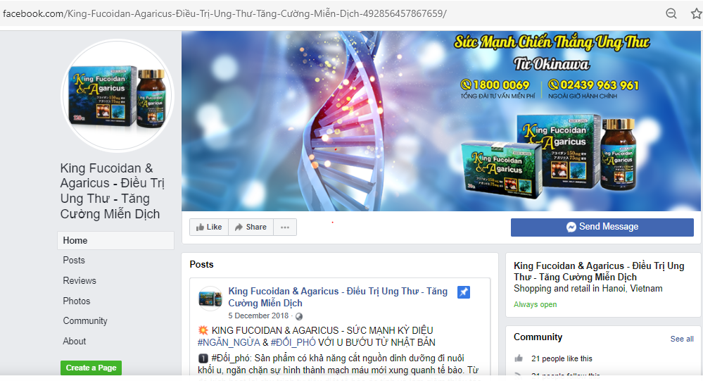 Cục An toàn thực phẩm cho biết, thời gian vừa qua trên Facebook tại đường link https://www.facebook.com/King-Fucoidan-Agaricus-%C4%90i%E1%BB%81u-Tr%E1%BB%8B-Ung-Th%C6%B0-T%C4%83ng-C%C6%B0%E1%BB%9Dng-Mi%E1%BB%85n-D%E1%BB%8Bch-492856457867659