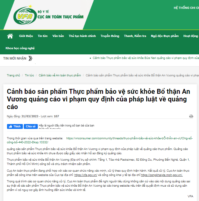 Cụ thể, theo Cục An toàn thực phẩm, trong thời gian vừa qua trên trang website https://vnconsumer.com/community/threads/thực-phẩm-bảo-vệ-sức-khỏe-bỔ-thẬn-an-vƯƠng-số-công-bố-440-2022-Đksp.13332/ đã có hành vi quảng cáo sản phẩm Thực phẩm bảo vệ sức khỏe Bổ thận An Vương vi phạm quy định của pháp luật về quảng cáo thực phẩm và quảng cáo thực phẩm bảo vệ sức khỏe khi chưa được cấp giấy xác nhận hồ sơ đăng ký quảng cáo.