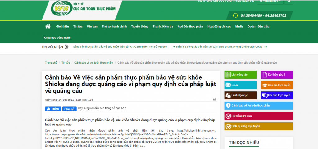 Quá trình làm việc với Cục An toàn thực phẩm, cả công ty đăng ký bản công bố và công ty sản xuất đều khẳng định không thực hiện quảng cáo sản phẩm thực phẩm bảo vệ sức khoẻ Shioka vi phạm trên các trang và clip nêu trên.
